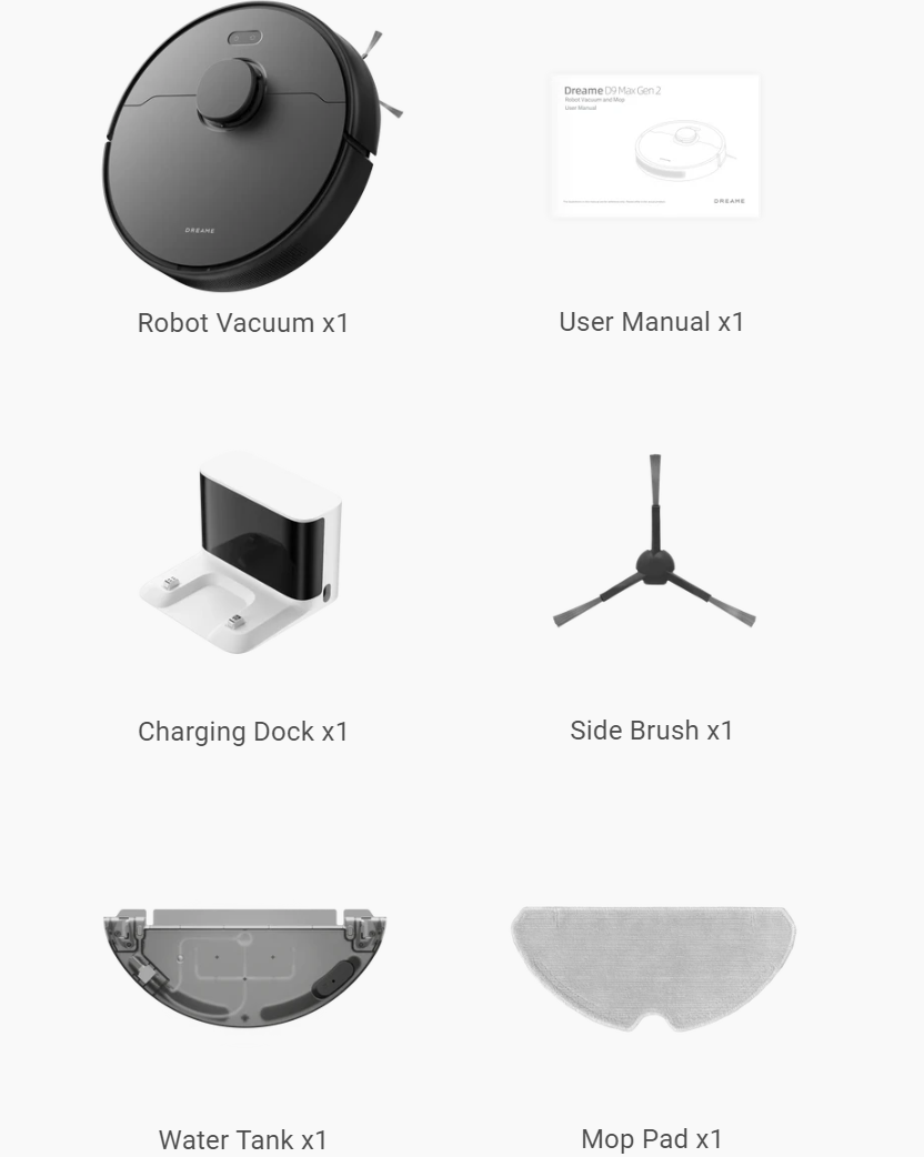| Dust Bag Volume10 | 260mins (Vacuuming only or Mopping only in Queiet Mode) 180mins (Vacuuminng and Mopping in Quiet Mode) |