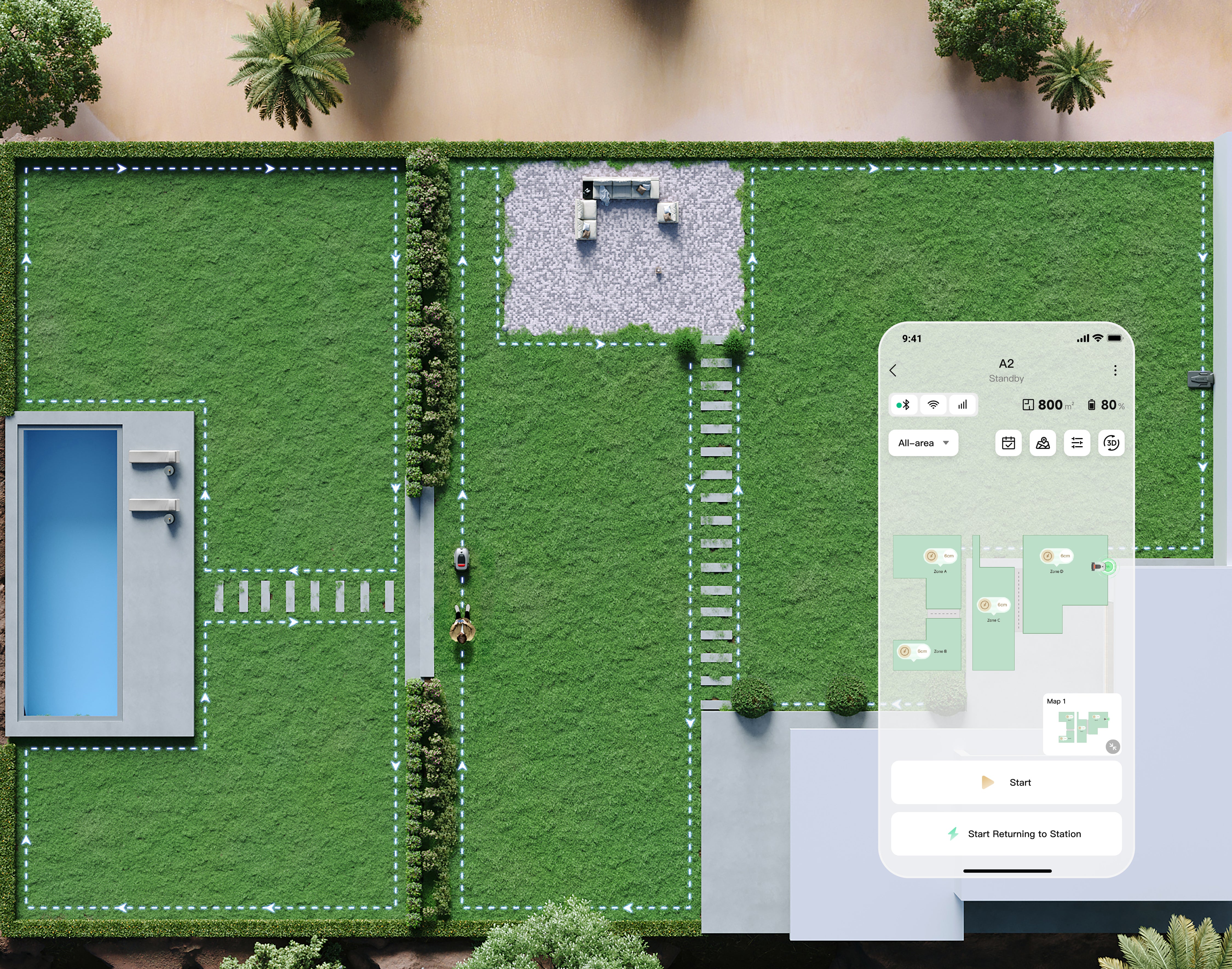 Perfect for homes with disjointed front and back yards, A2 allows you to create and manage 2 independent maps. Customize distinct mowing plans for each area, saving you time and eliminating the need for an additional mower. It is also ideal for owners of multiple properties.