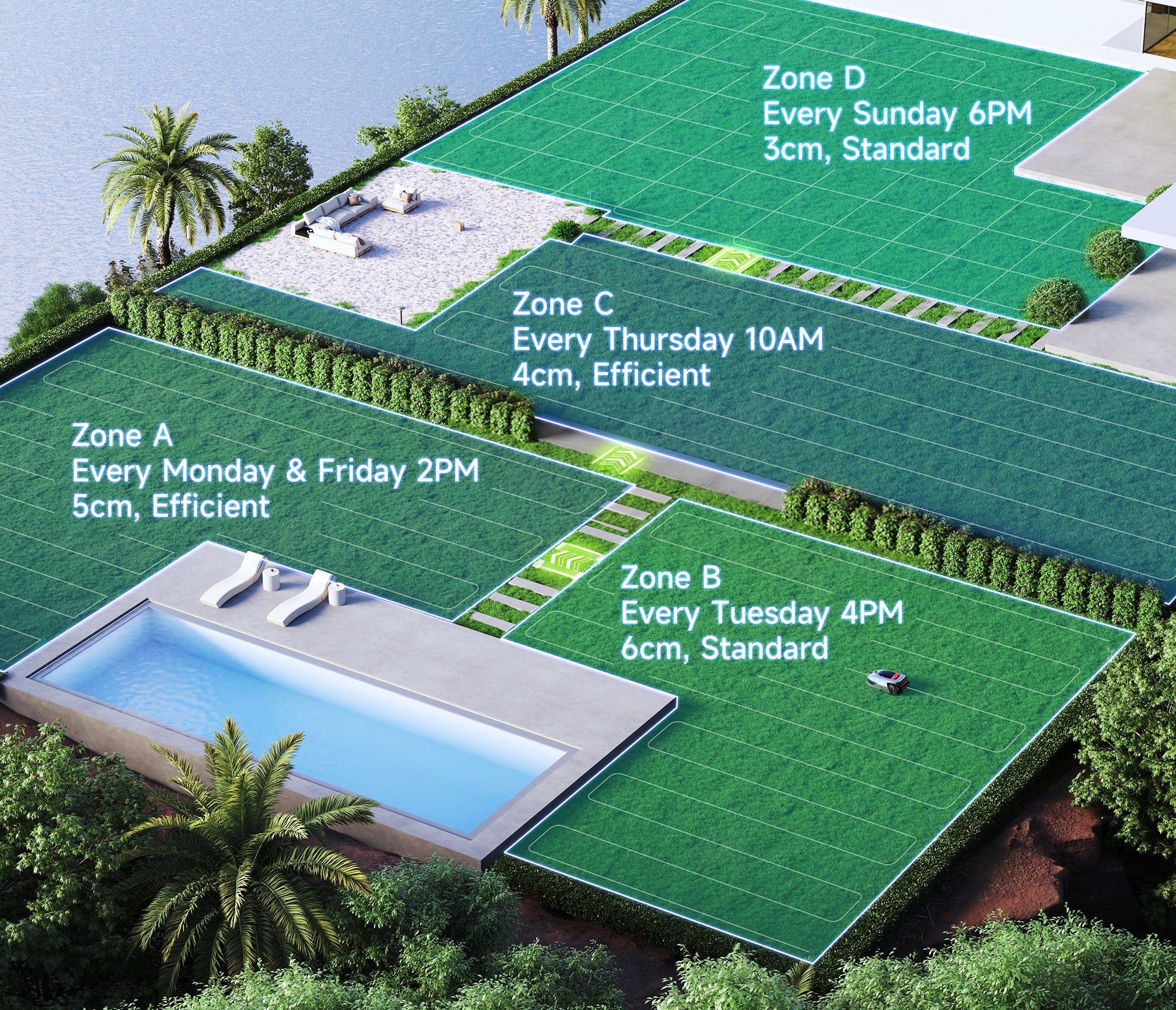 Easily set up multiple mowing zones through the Dreamehome App. Customize various mowing settings for each zone. A2 automatically navigates between these areas, finishing the job seamlessly and efficiently.