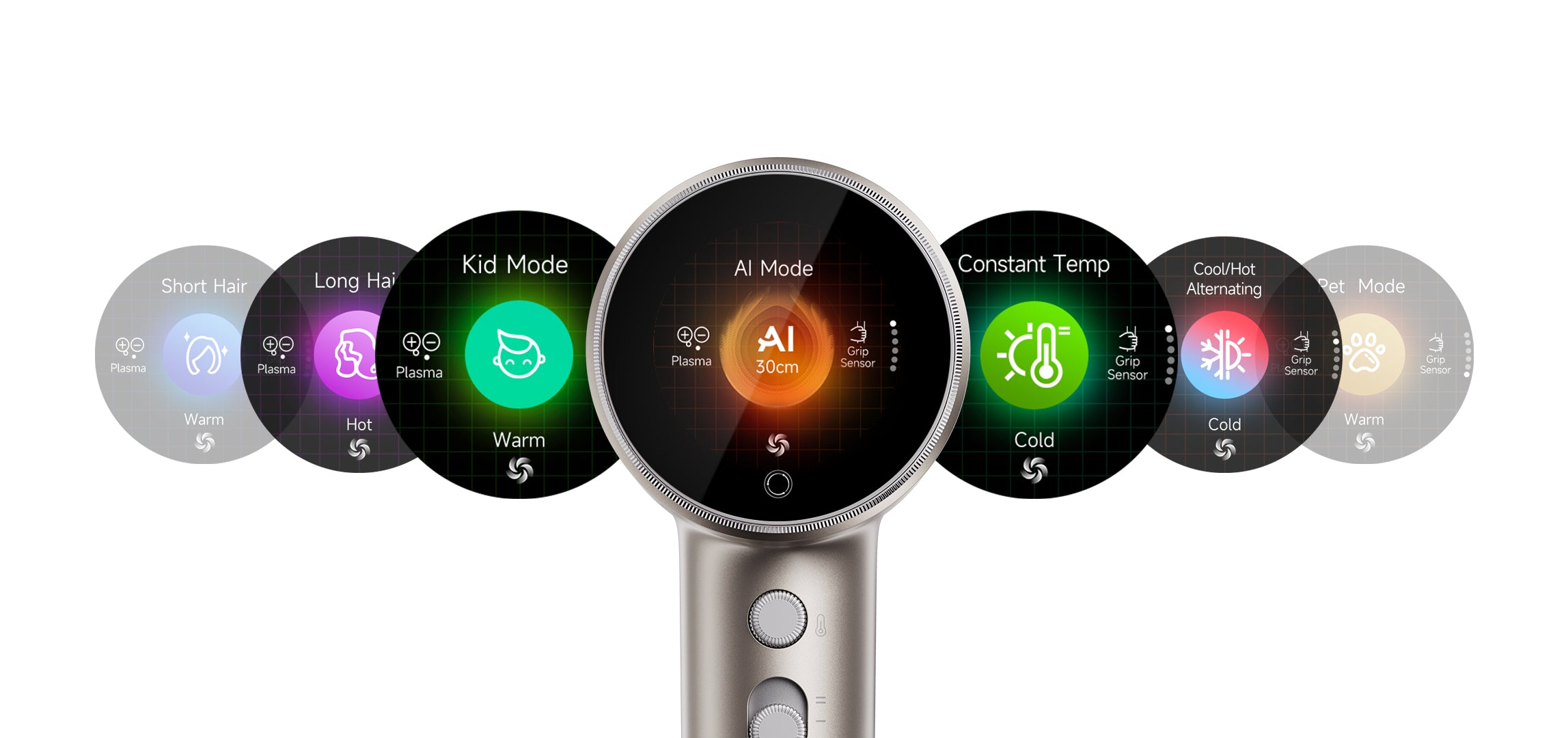AI režīms, ko nodrošina uzlabota TOF sensoru tehnoloģija, precīzi regulē temperatūru 5–30 cm attālumā. Tas uztur nemainīgu 55 °C temperatūru, nodrošinot komfortablu un stabilu siltumu, vienlaikus saudzīgi aizsargājot gan galvas ādu, gan matu veselību.