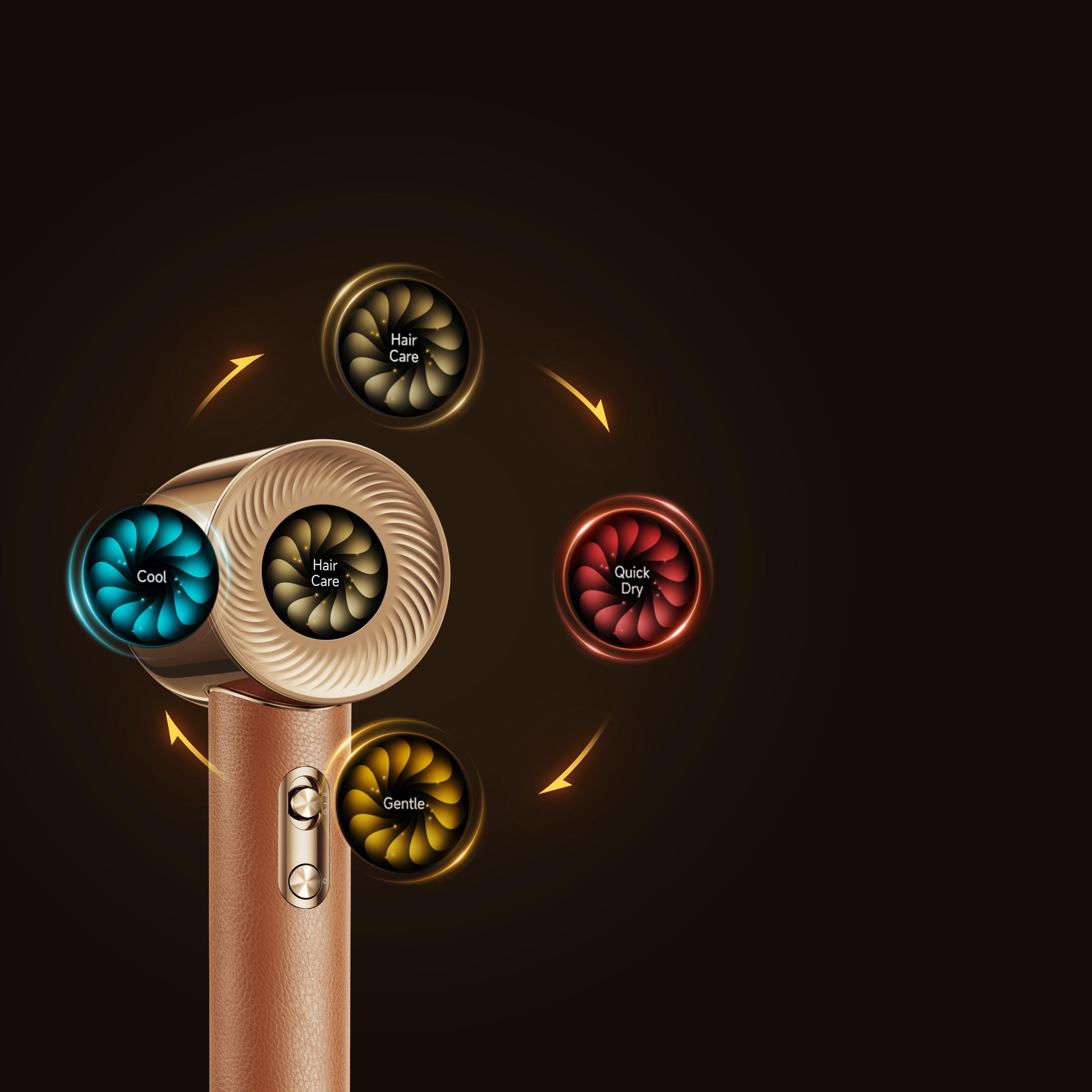 Izvēlieties vēsu gaisu žāvēšanai zemākā temperatūrā, ātro žāvēšanu ar karstu gaisu vai maigu režīmu veselīgiem matiem. Reāllaika žāvēšanas režīms tiek parādīts LCD panelī.