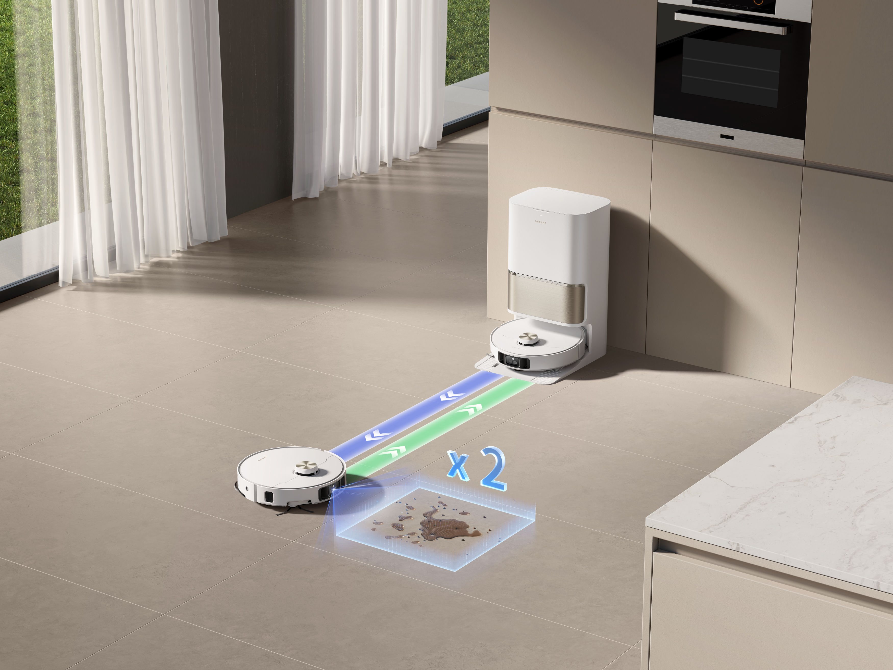 Nodrošina līdz 30 000 Pa sūkšanas jaudu, lai efektīvi savāktu netīrumus no visām virsmām, ar lietotnē regulējamiem jaudas iestatījumiem.